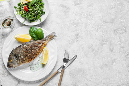 Fried fish and vegetables on a plate. Concrete gray countertop. High quality photo
