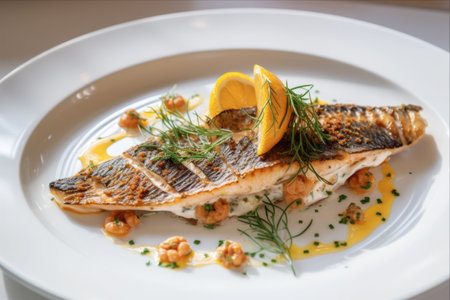 An elegant gourmet dish featuring grilled fish served over a vibrant bed of fresh vegetables, perfect for showcasing culinary art and flavor.