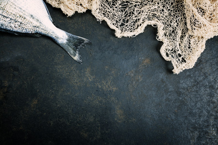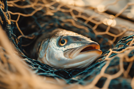 Fish caught in fishing net, illustrating impact of human waste on marine life and ecosystem