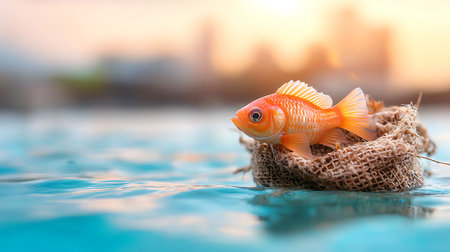 A beautifully lit fishing net sits against a shimmering water surface at sunset, creating a serene and artistic mood, perfect for nature-themed projects.