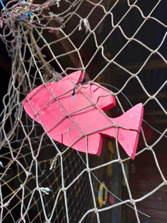Decorative pink wooden fish hanging on fishing net. Rustic and vintage sea life decor. Fishing net with ornamental fish.