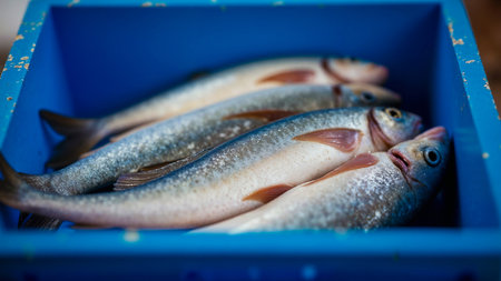 Fresh fish in a blue tray - industrial ocean fish catch. Generative AI