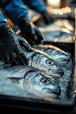 Workers handling fresh fish on ice, industrial setting, blue uniforms, gloved hands, focused, cool lighting