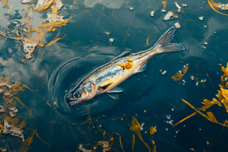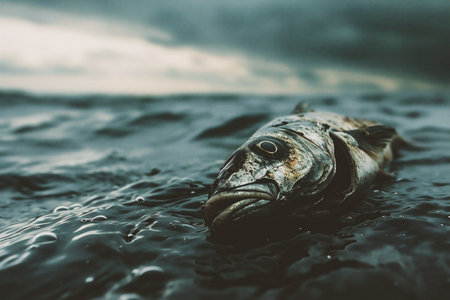 Dead fish on the surface of the sea. The concept of problem fishing.