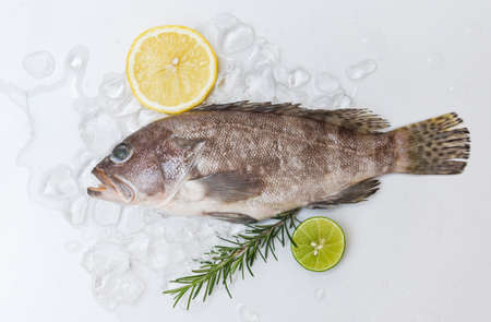 Fresh raw sea bass fish with spices, salt, lemon and thyme on a wooden kitchen board before cooking. Sea bass fish
