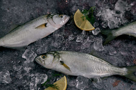 top down view of raw sea bream fish dorado on ice. Health food. space for text. generative AI.