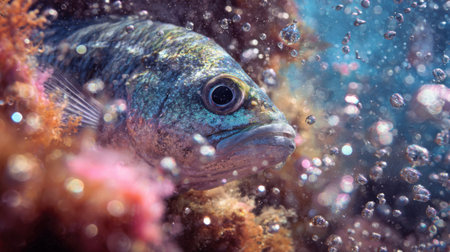A stunning close-up of a colorful fish amid a vibrant underwater scene filled with coral and bubbles, capturing the beauty of marine life.