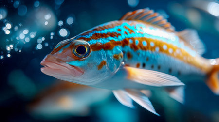 Vibrant tropical fish swimming underwater with sparkling light reflections and striking colors.