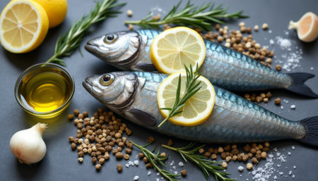 Two glistening fish lie on a dark surface, adorned with vibrant lemon slices and fresh rosemary. This culinary composition evokes a sense of freshness and flavor, perfect for inspiring delicious seafood dishes.