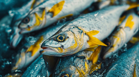 Freshly caught fish lined up on a clean surface, glistening with moisture and ready for culinary delight. The image captures the essence of freshness and quality, showcasing the fishs shimmering scales and vibrant colors, perfect for seafood lovers and culinary enthusiasts