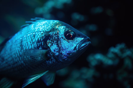 A vibrant underwater scene featuring small fish swimming among colorful aquatic plants, illuminated by soft light. This image captures the beauty and tranquility of marine life. Generative AI