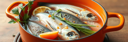 Cooking concept. Fish in the cut saucepan with water. 3d illustration