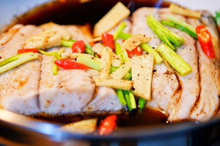 A delicious Chinese dish, steamed sea bass fillets