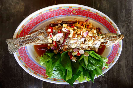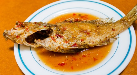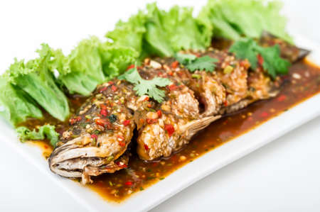 Crispy fry grouper is topped with chili sauce on white dish,fried grouper fish with sauce,