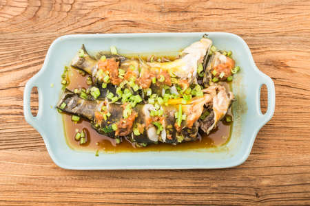 Steamed sea bass with lemon, chili and garlic sauce in bowl on old relic wooden table.
