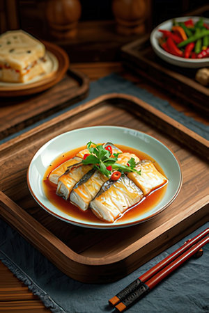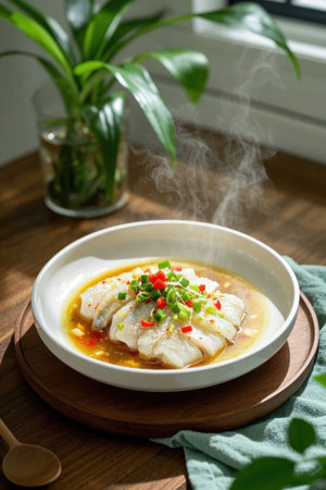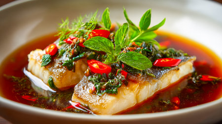 A beautifully plated dish featuring tender steamed fish garnished with aromatic herbs and fiery chili, served in a fragrant, savory broth that invites a warm, comforting aroma