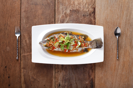 Steamed thai flavor sour and spicy fish served on the plate in restaurant