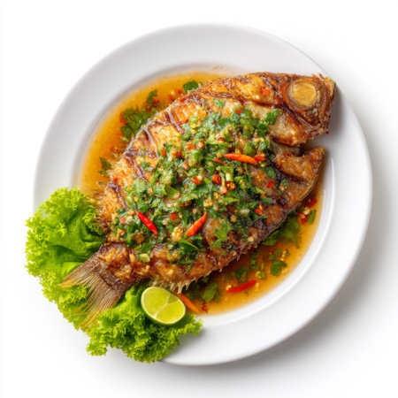 A close-up of crispy fried seabass glazed with fish sauce, garnished with thinly sliced fresh herbs and chilies, presented on a clean, white plate with vibrant colors