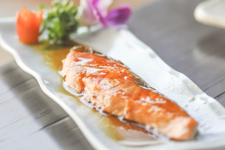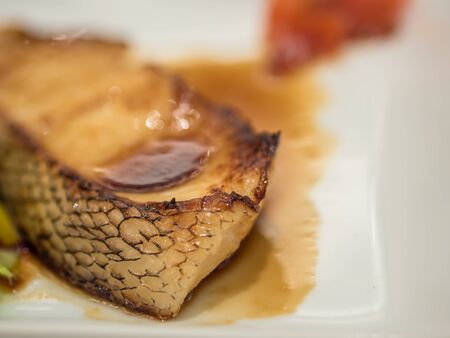 Grilled snowfish with soy sauce on plate