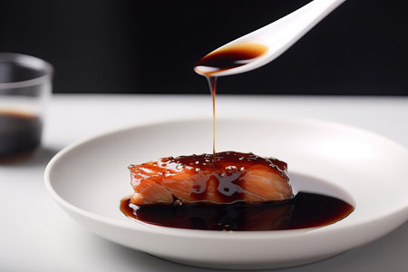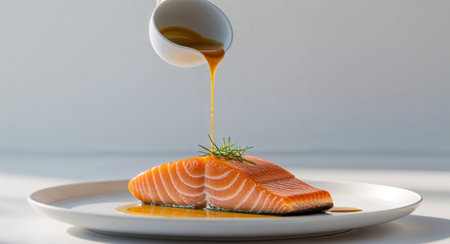 AI Generated. A plate of salmon with sauce being poured over it