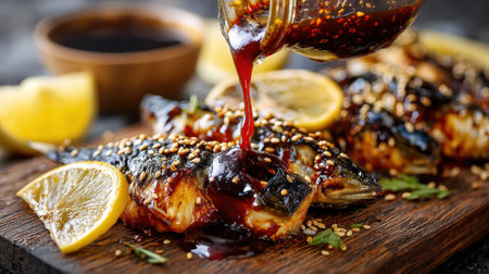 Grilled fish topped with a glossy sauce is presented on a wooden platter. Fresh lemon slices accompany the dish, adding a bright touch to the meal, enhancing the overall flavors.