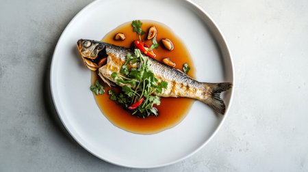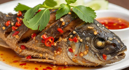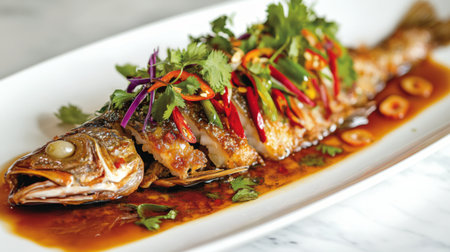 A beautifully presented whole fish dish, garnished with fresh herbs and chili peppers, served in a savory sauce, perfect for food enthusiasts and culinary experiences.
