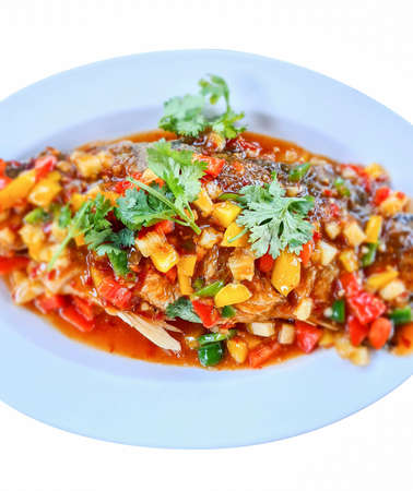 Steamed fish with chili sauce on white plate,Thai food