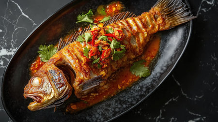 A beautifully presented fried fish garnished with spicy herbs and chili on a black plate, perfect for showcasing culinary artistry in seafood dishes.