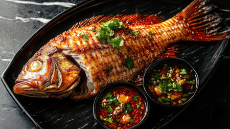 A beautifully grilled fish served on a sleek plate, accompanied by vibrant spicy dips. Perfect for food lovers seeking a colorful culinary experience.