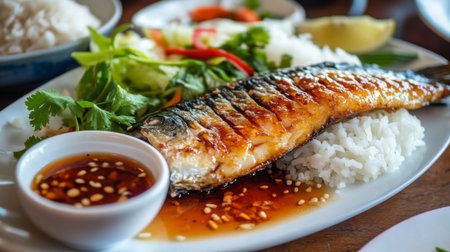 A wide shot of fried seabass with a shiny fish sauce glaze, paired with steamed rice and a small bowl of dipping sauce, showcasing the essence of Thai dining