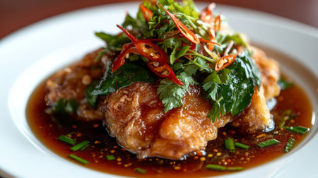A visually appetizing plate featuring crispy fried chicken adorned with fresh herbs and spicy chilis, set in a rich savory sauce, perfect for food lovers.