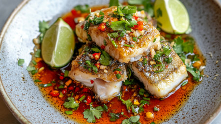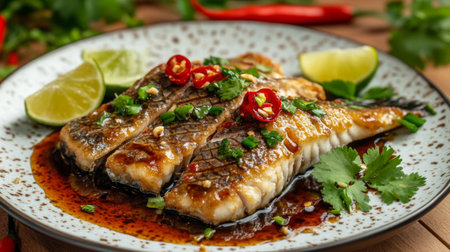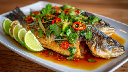 Savory fish dish garnished with spicy chilies and fresh herbs, served with lime wedges, showcasing vibrant colors and enticing flavors on a rustic wooden table.