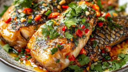 Experience the mouthwatering allure of beautifully grilled fish fillets garnished with vibrant herbs, fresh chili, and a zesty sauce, ideal for any culinary gathering.
