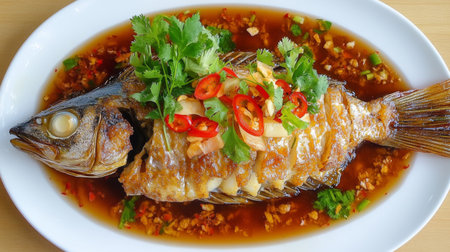 A crispy whole fried fish topped with a spicy red chili and garlic sauce, garnished with fresh herbs. This appetizing Asian seafood dish is served on a white plate, ready to be shared.