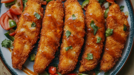 Enjoy a vibrant display of crispy breaded fish fillets topped with savory sauce, served with fresh vegetables on a decorative plate for a stunning meal presentation.