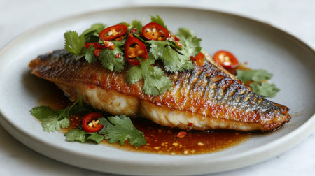 A beautifully grilled fish fillet, garnished with fresh herbs and slices of red chili peppers, presented on a round plate, highlighting vibrant colors and inviting flavors.