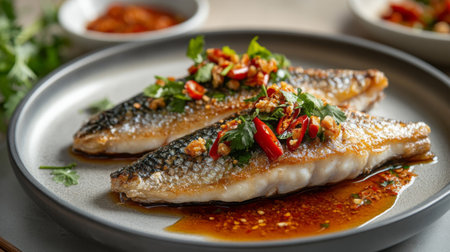 A beautifully presented grilled fish dish topped with spicy sauce, fresh herbs, and crispy garnish. Perfect for seafood lovers looking for flavor and texture.