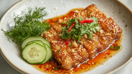 A captivating close-up of a beautifully presented glazed fish dish, topped with fresh herbs and chili, served alongside crisp cucumber slices, perfect for food enthusiasts.