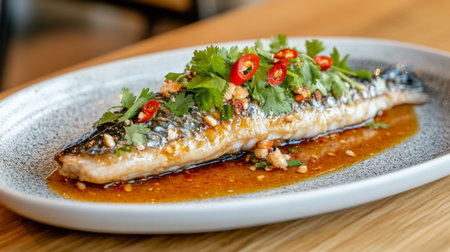 A beautifully presented grilled whole fish garnished with fresh herbs, spicy chili, and a flavorful sauce. Perfect for showcasing gourmet dining.