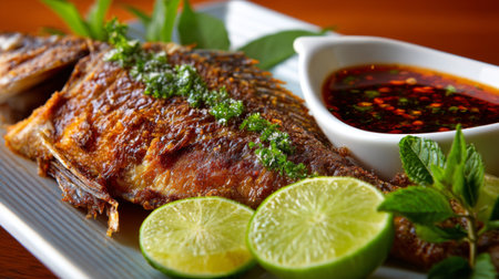 This stunning display features a crispy grilled fish topped with fresh herbs and accompanied by vibrant lime slices and a spicy dipping sauce, perfect for any meal.