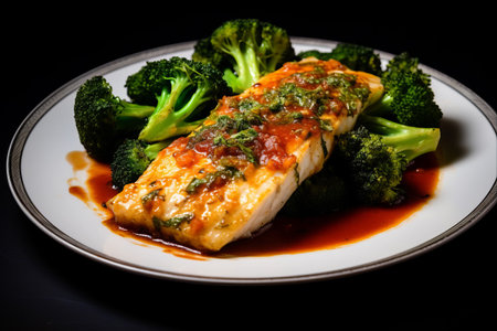 Delectable Fish with a Splash of Color: Green Broccoli and Red Sauce on a Pristine White Plate
