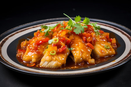 Fried mackerel in sweet and sour sauce on black table