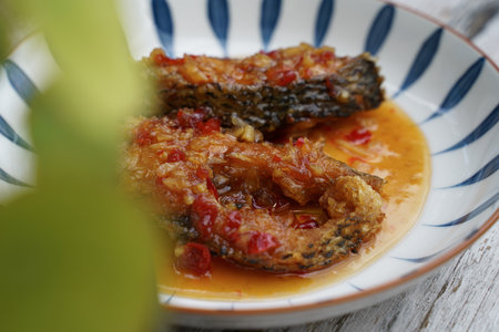 Fried fish with chilli in a ceramic plate on an old wooden floor. The taste is sour, sweet and slightly spicy.