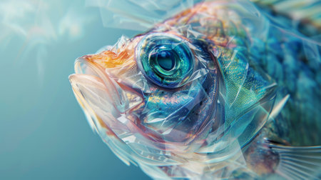 A fish with a blue and orange face is shown in a blue background. The fish has a plastic-like appearance, which gives it a surreal and otherworldly feel. The image is a creative