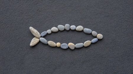 This image features a unique design composed of smooth pebbles arranged to resemble a fish on a dark textured surface, combining nature and artistic creativity.
