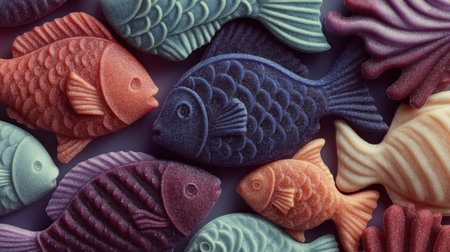 Colorful gummy fish swimming together on purple background