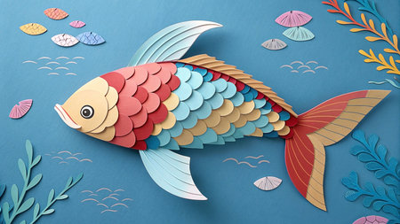 Toys wooden carved fish on a blue insulated background. Generative AI