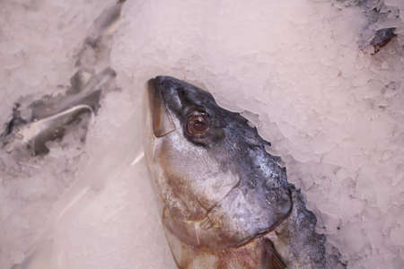 Frozen fish in ice is sold in the market. Natural seafood background. Close-up fish on the counter. Preservation of freshness of the product in ice at low temperature.