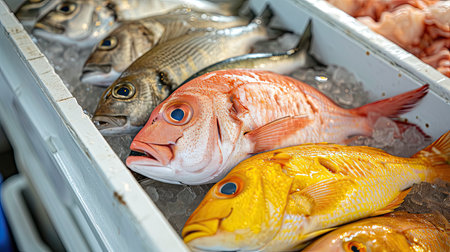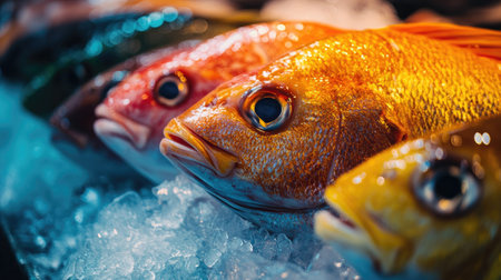 Fresh fish lined up in a seafood market, with vibrant scales glistening under cool light and icy surfaces.