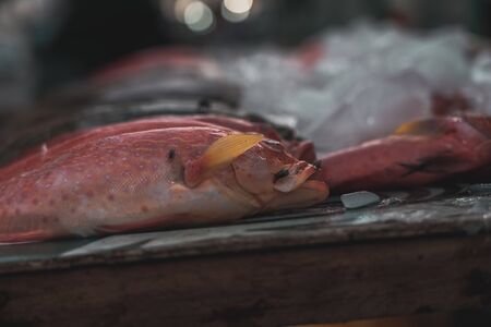 The market for marine fish. Street market. Sale of fresh fish. Freshly caught fish. Fish shop. Products for the restaurant. Fishery. Asian cuisine. Seafood. Healthy diet. Fisherman. Catch. Fresh food